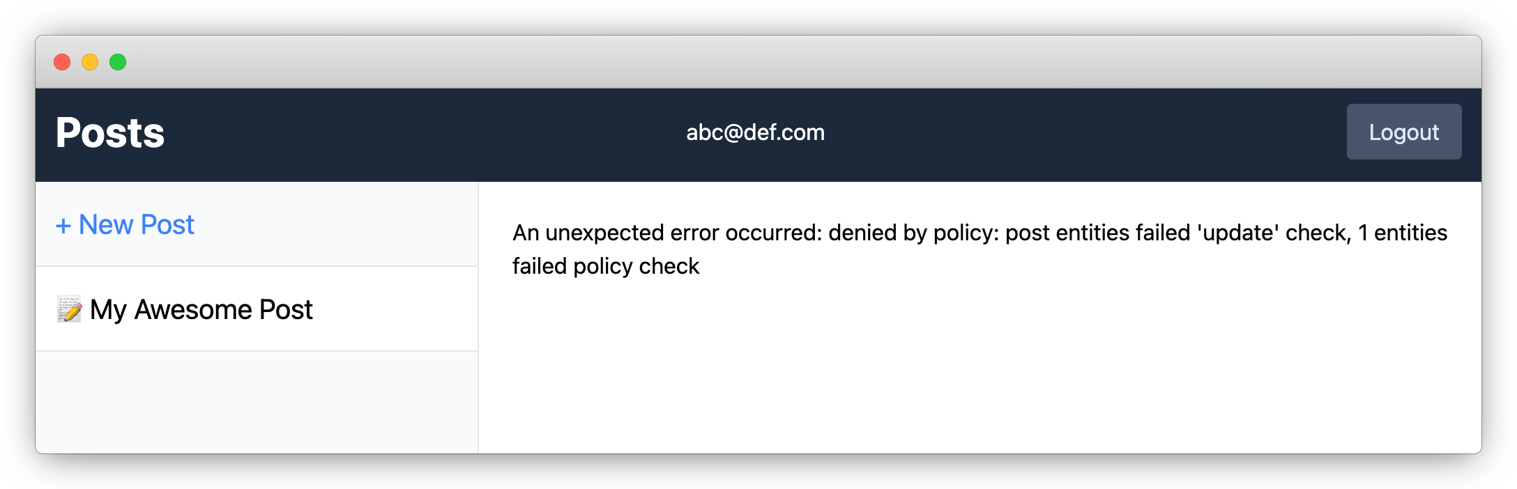 Since we haven't hidden "Unpublish" and "Delete" buttons for posts not owned by the current user, you can still click them even for posts not owned to you, but it will end up with an error. Even if you forget to block certain actions from the frontend, our access control logic will still prevent them from happening.